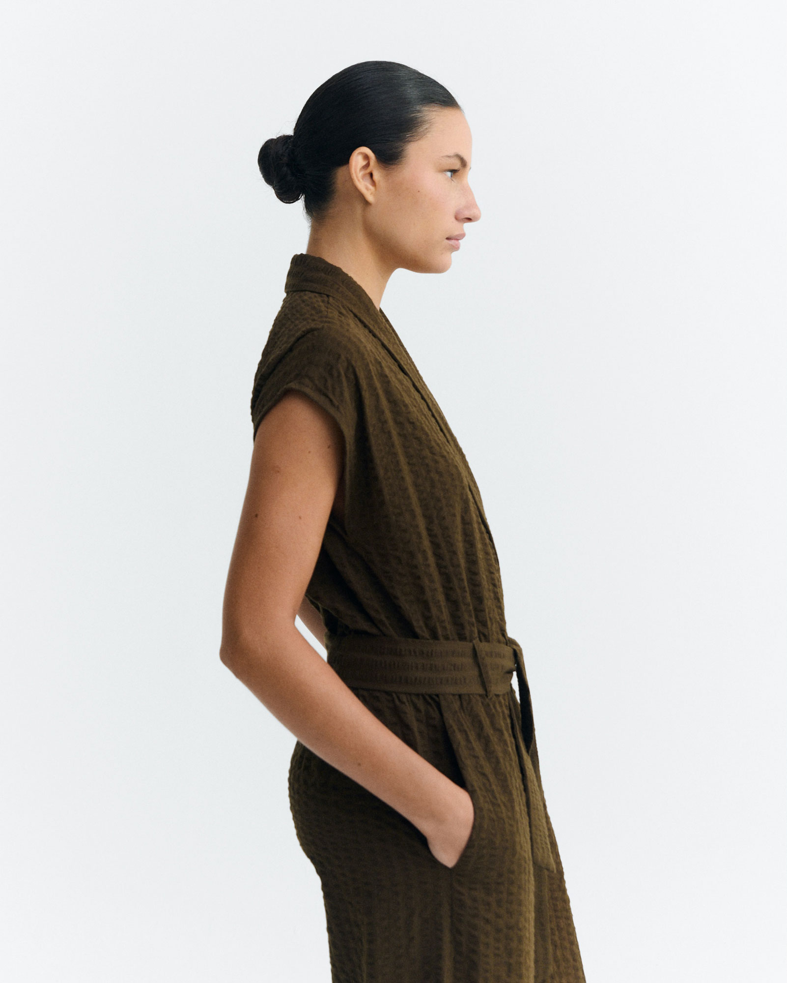 עם חגורה נקשרת במותן וסגירת כפתור,