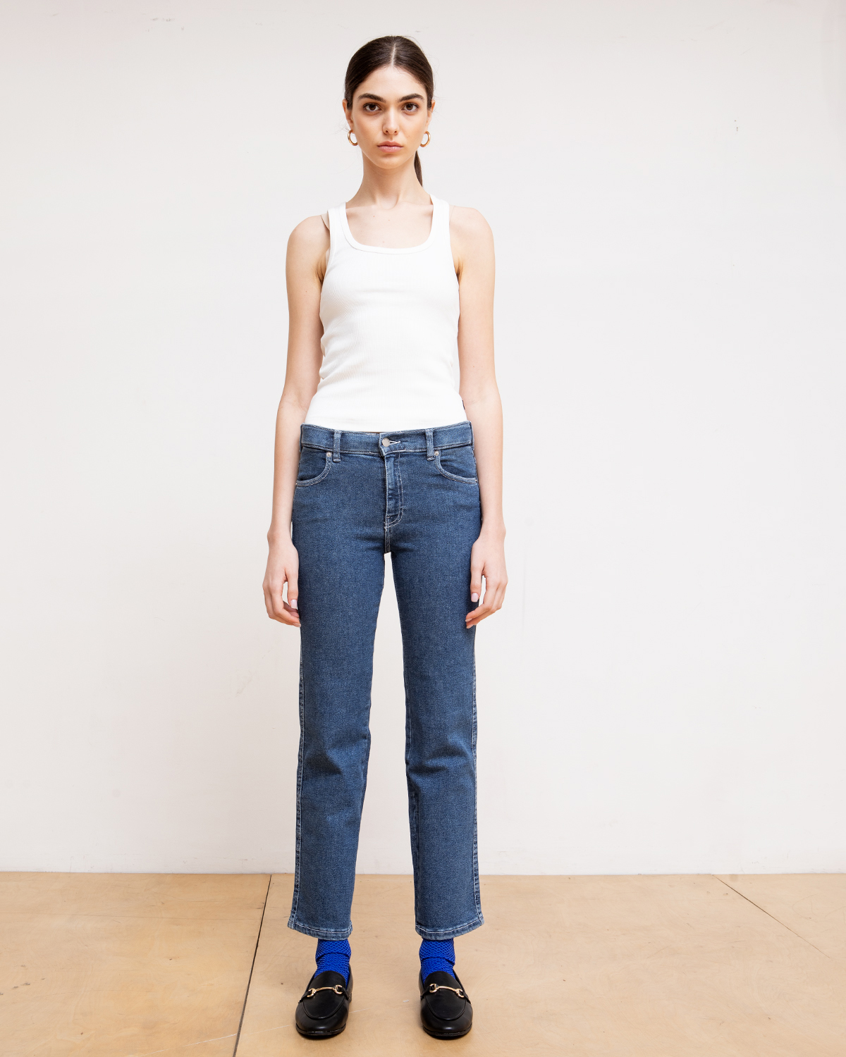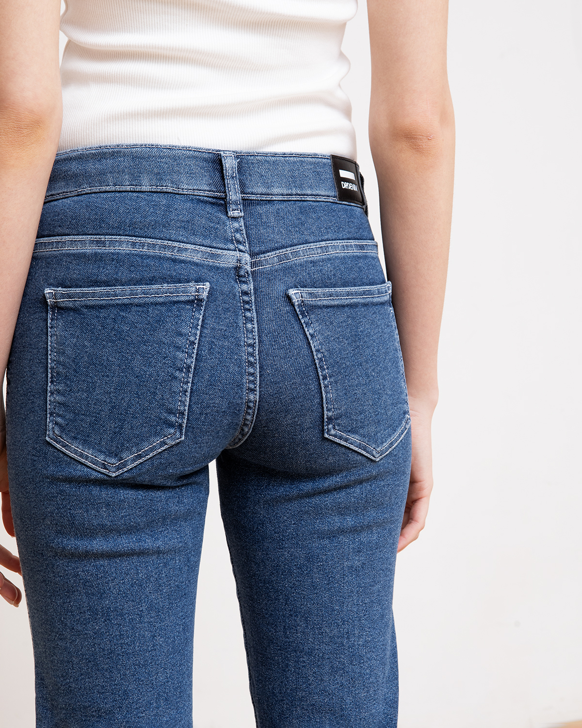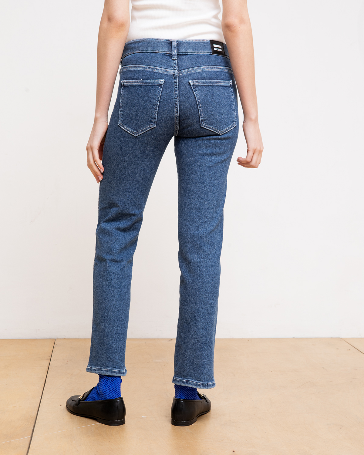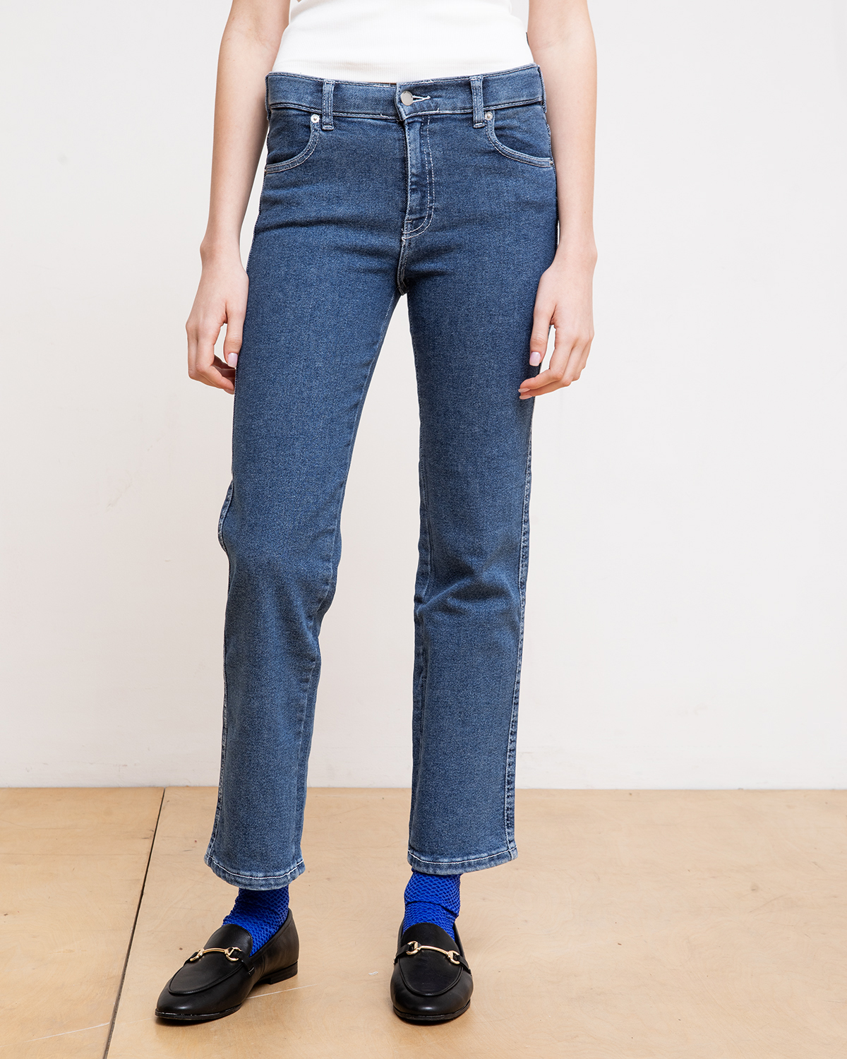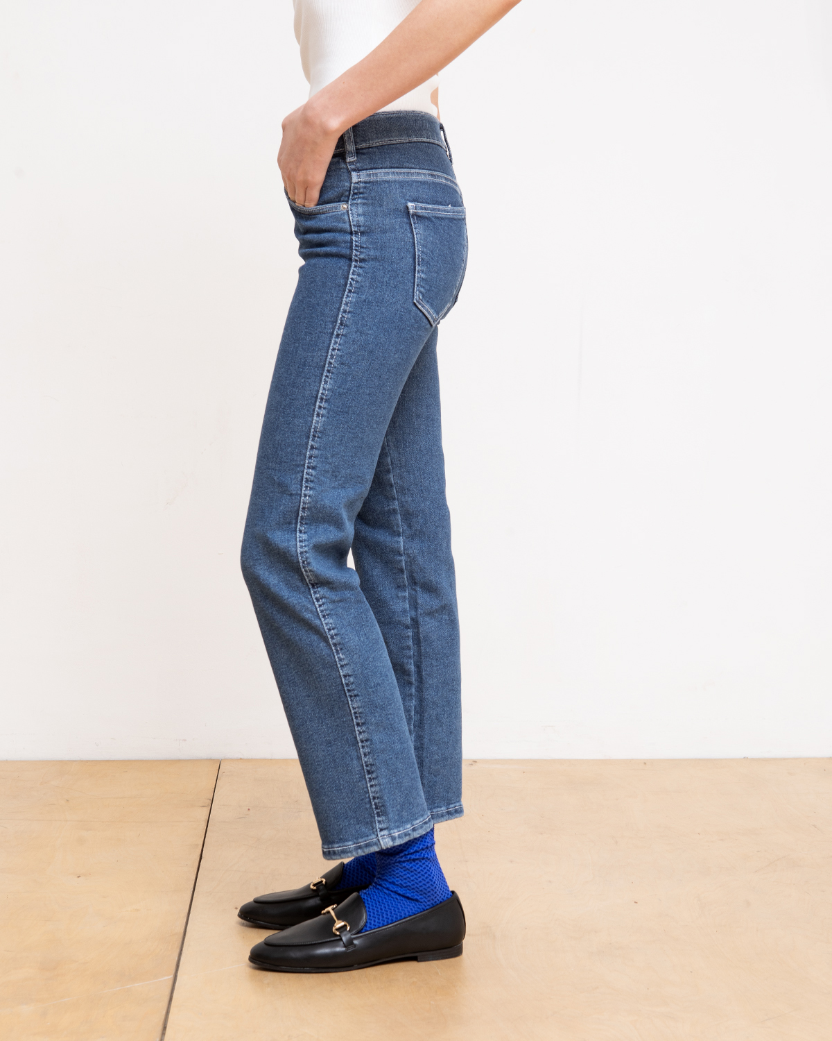 ג'ינס בגזרה ישרה, מותן בגובה אמצע (כמעט פופיק), מתחיל צמוד ומתרחב בהמשך.