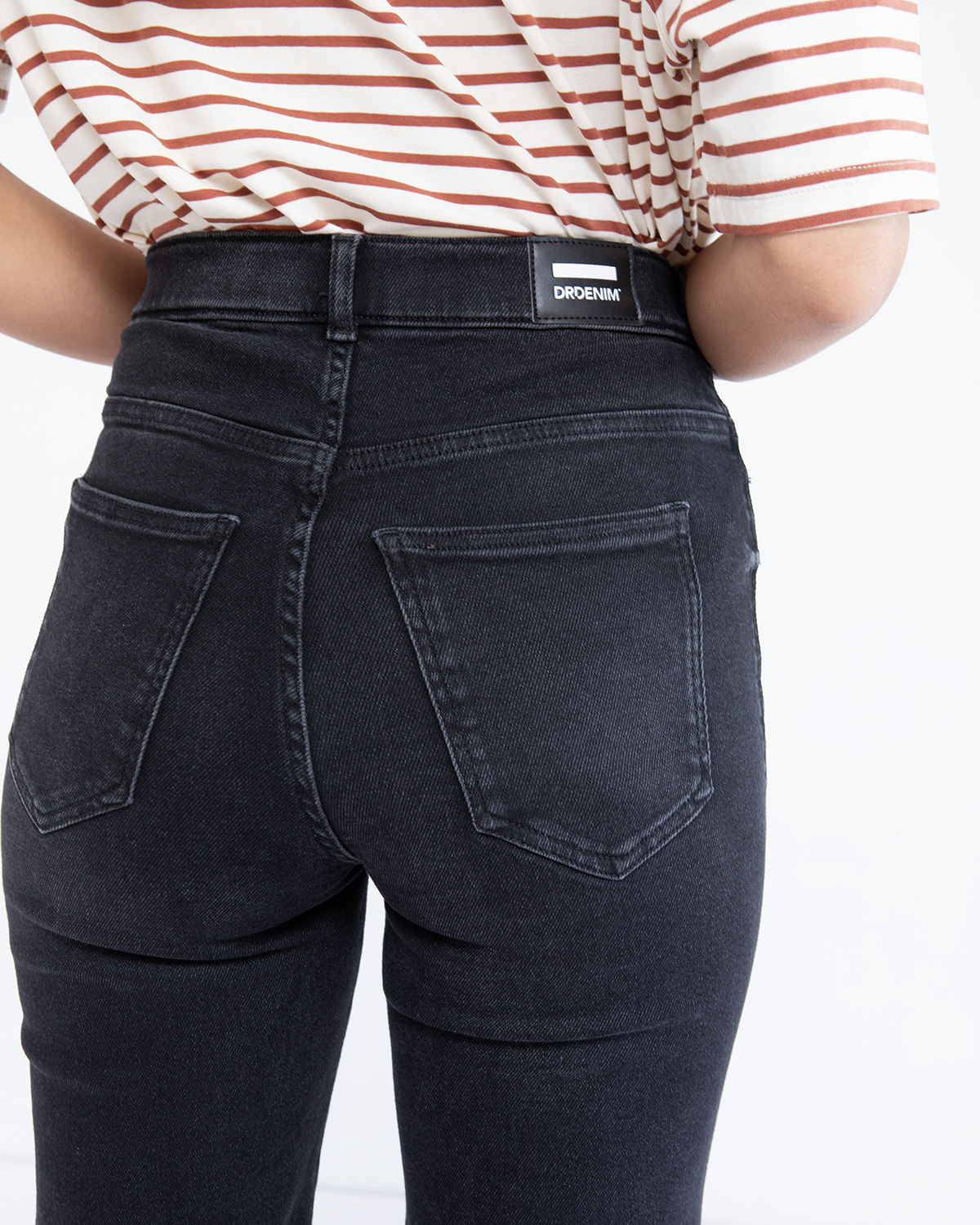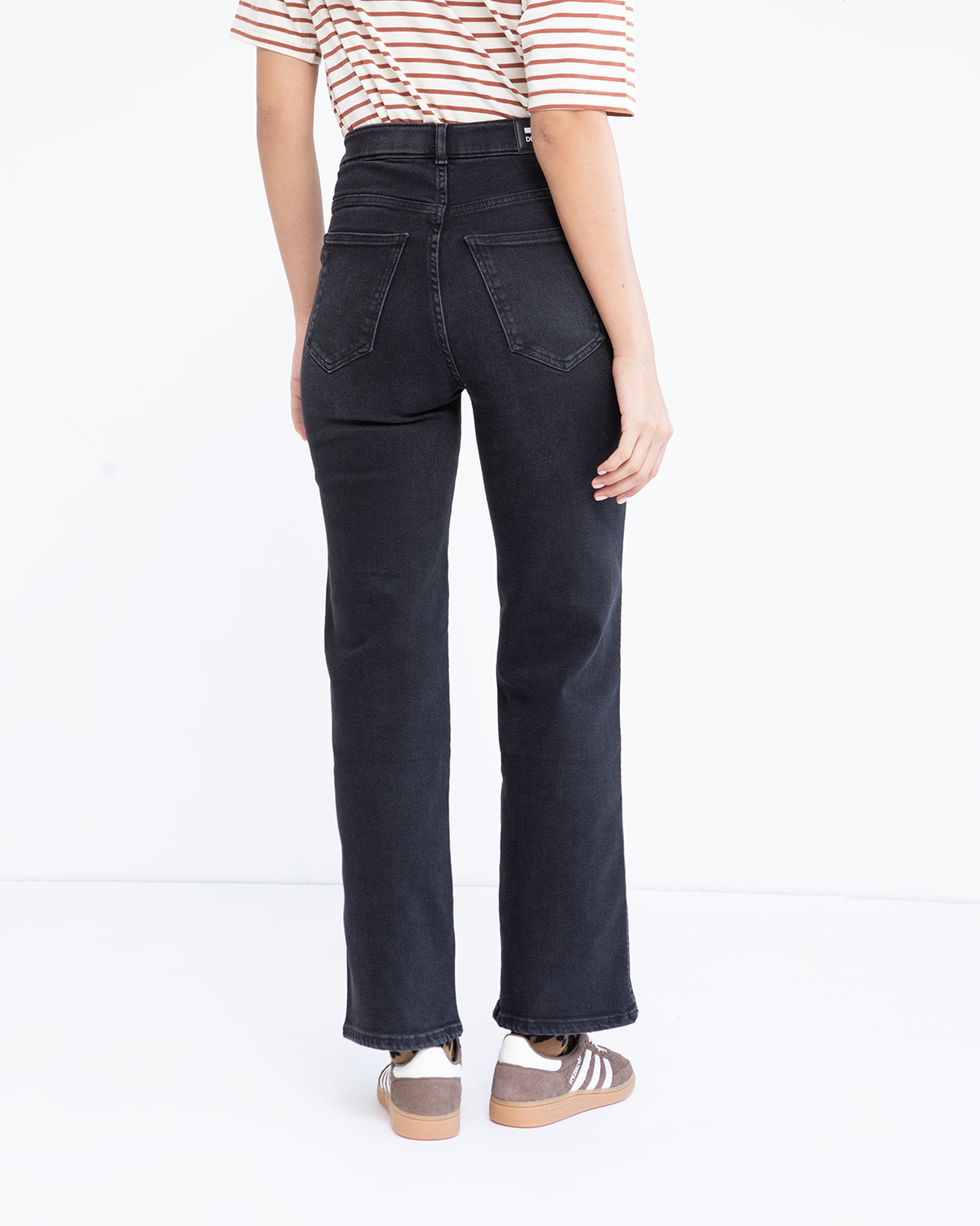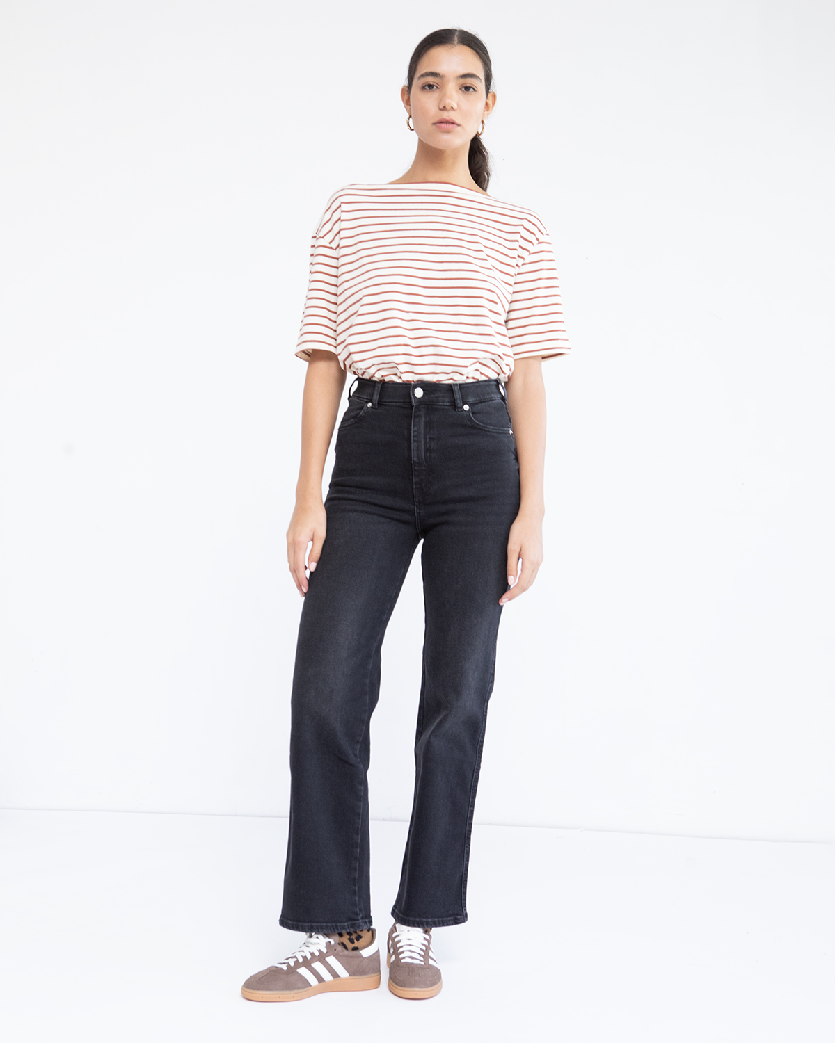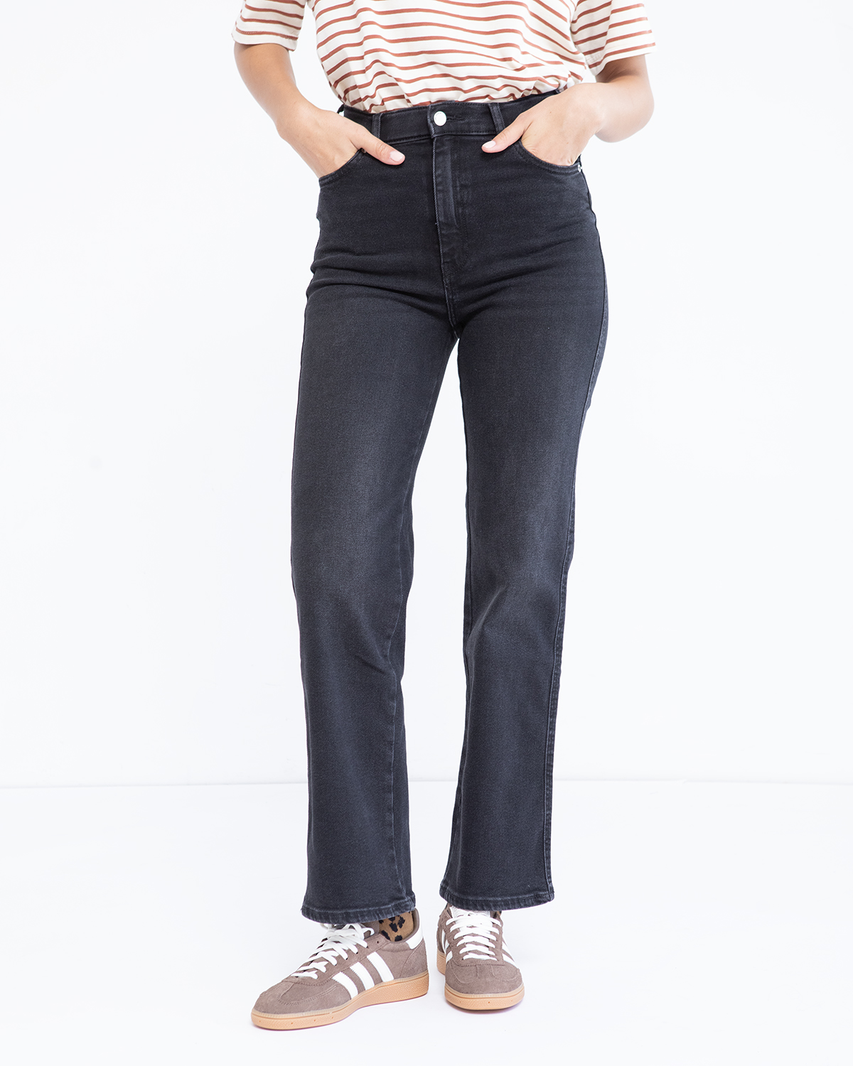 ג'ינס בגזרה ישרה, מותן גבוה, מתחיל צמוד ומתרחב בהמשך.