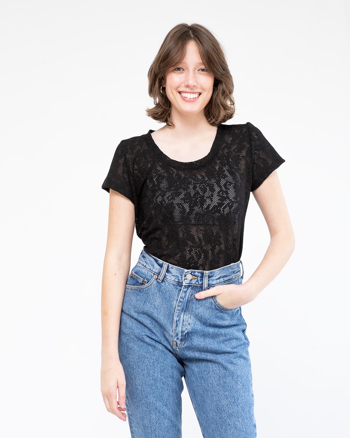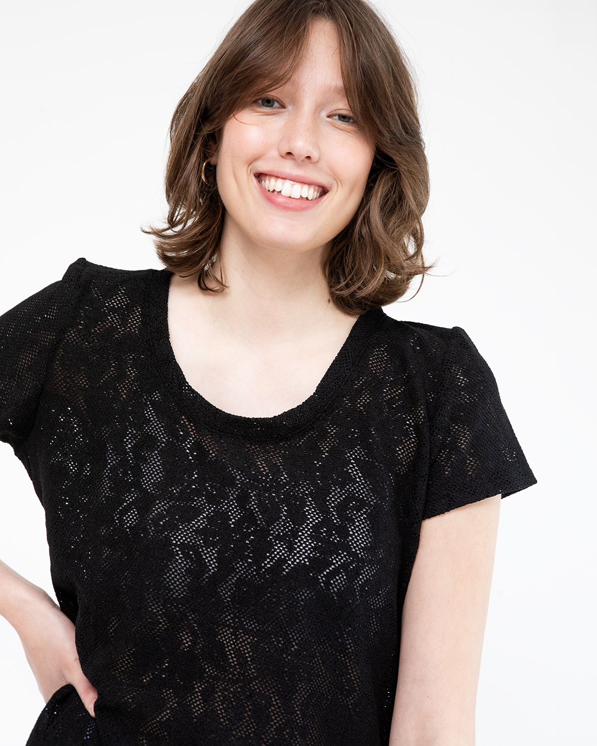 שרוולים קצרים, גזרה קרובה לגוף, מעט שקופה.