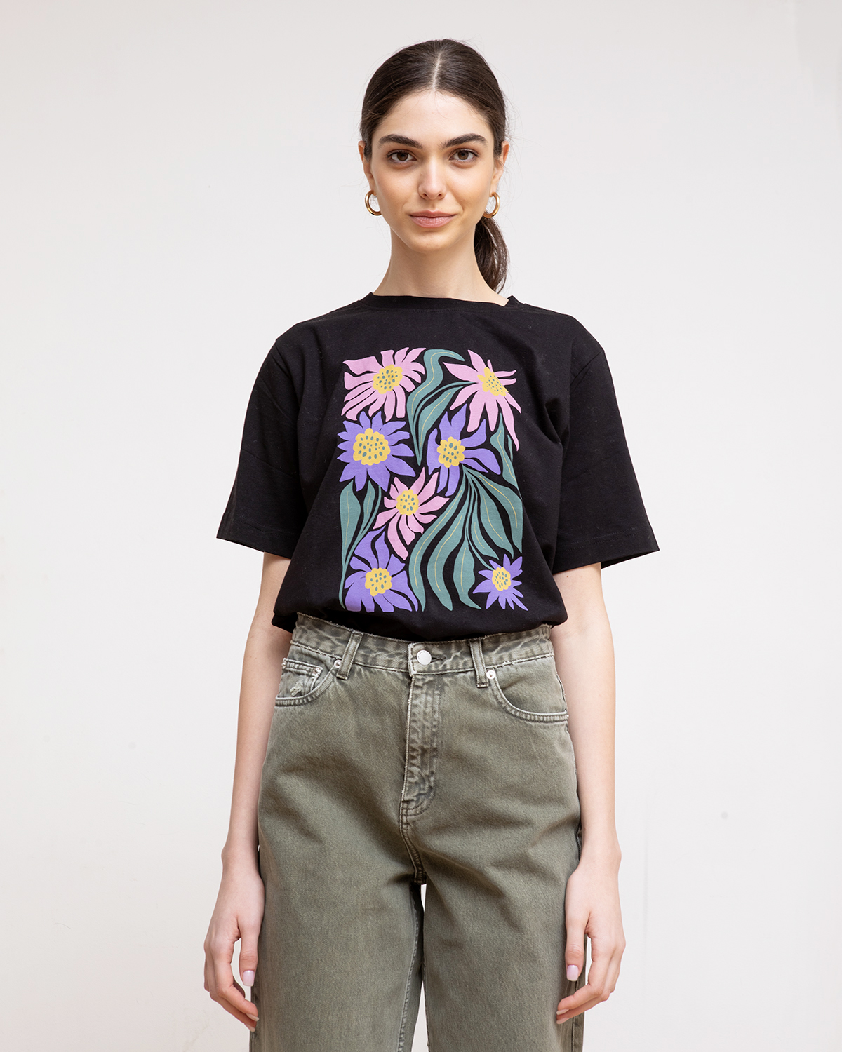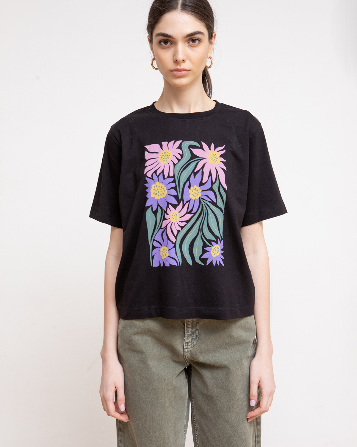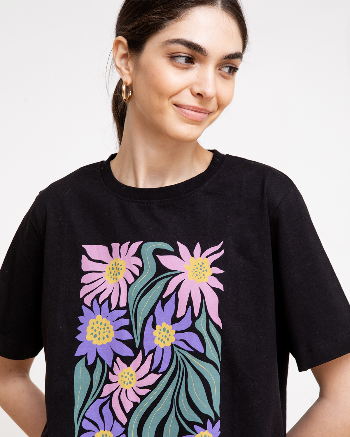 מפתח עגול, שרוולים עד (כמעט) המרפק, פרינט מושלם בחזית.
