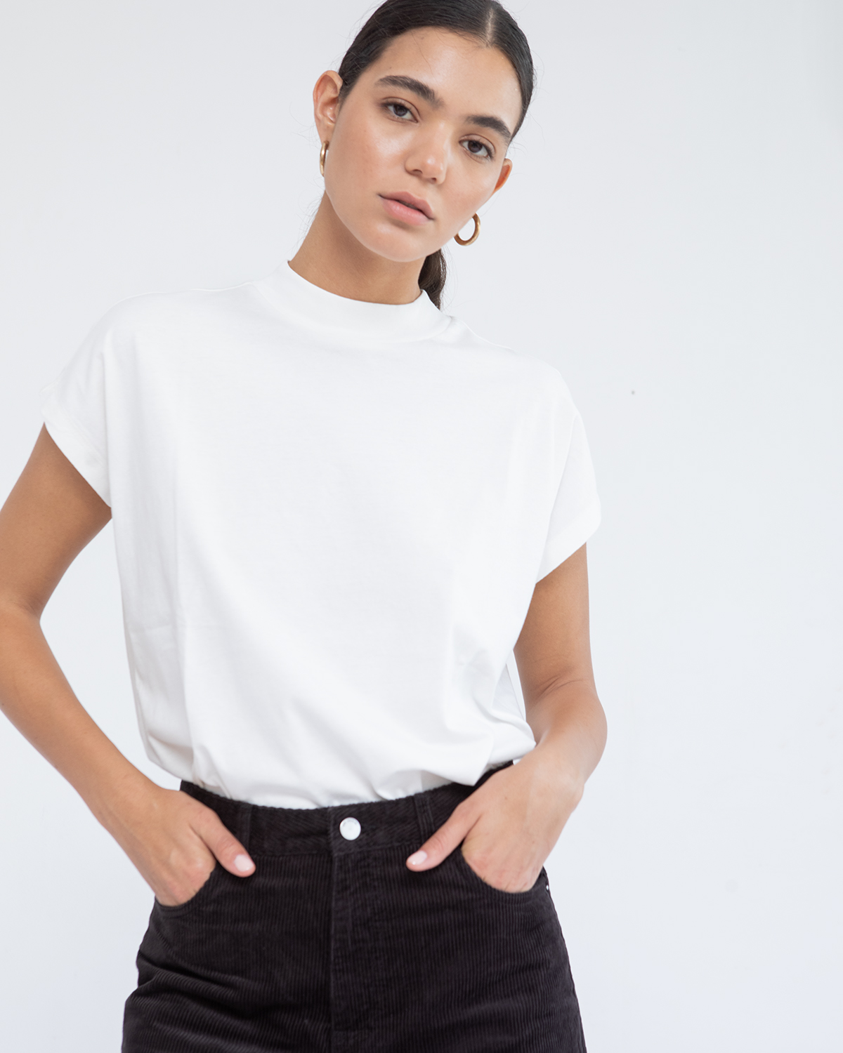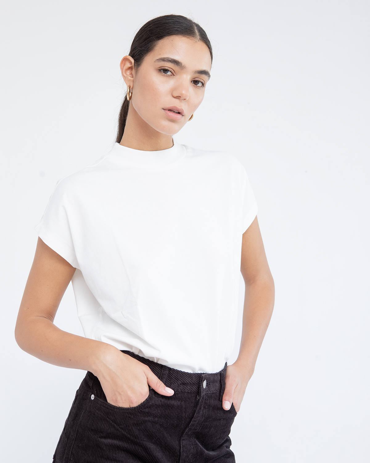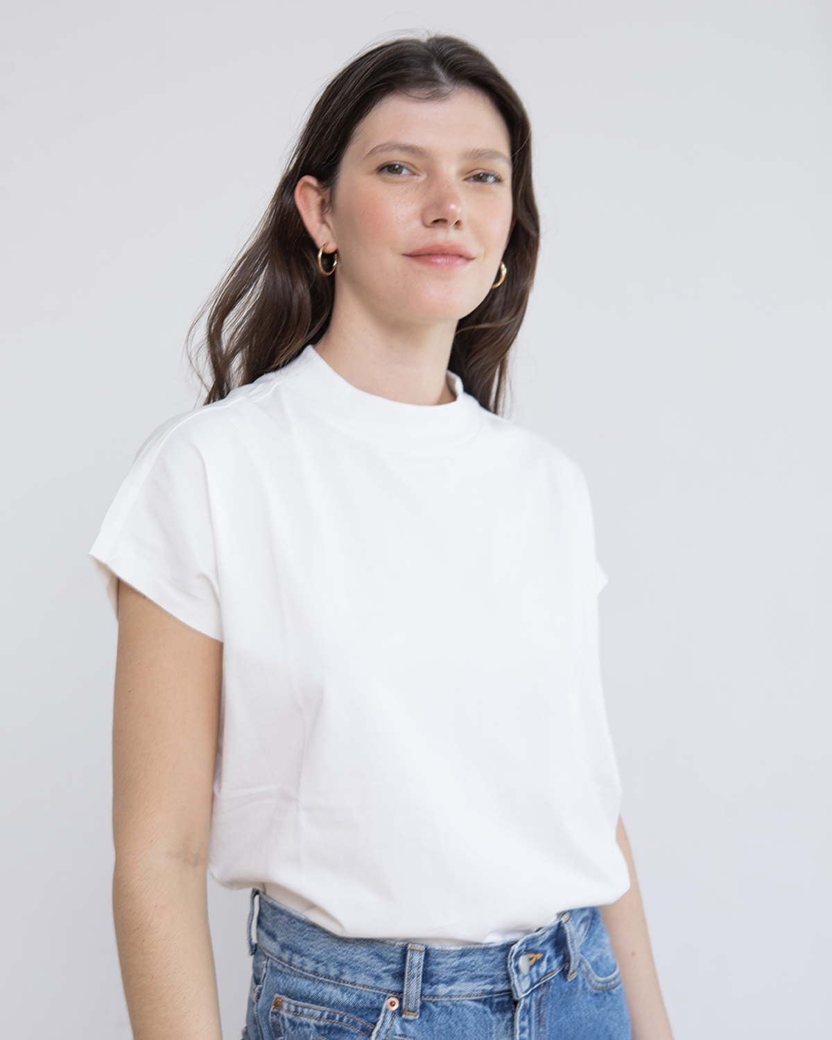 עם מפתח צוואר סגור וחצי שרוול.