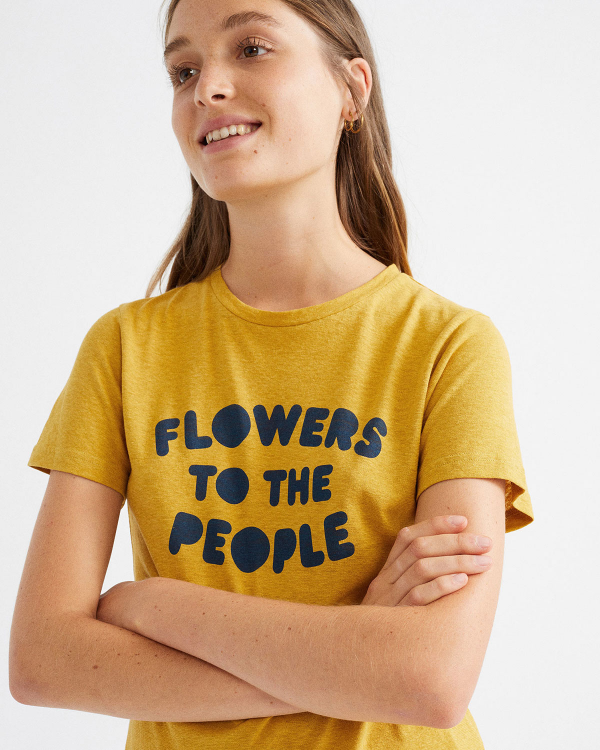 טי שירט קלאסית בצבע חרדל בוייב סבנטיז עם הכיתוב FLOWERS TO THE PEOPLE בנייבי.